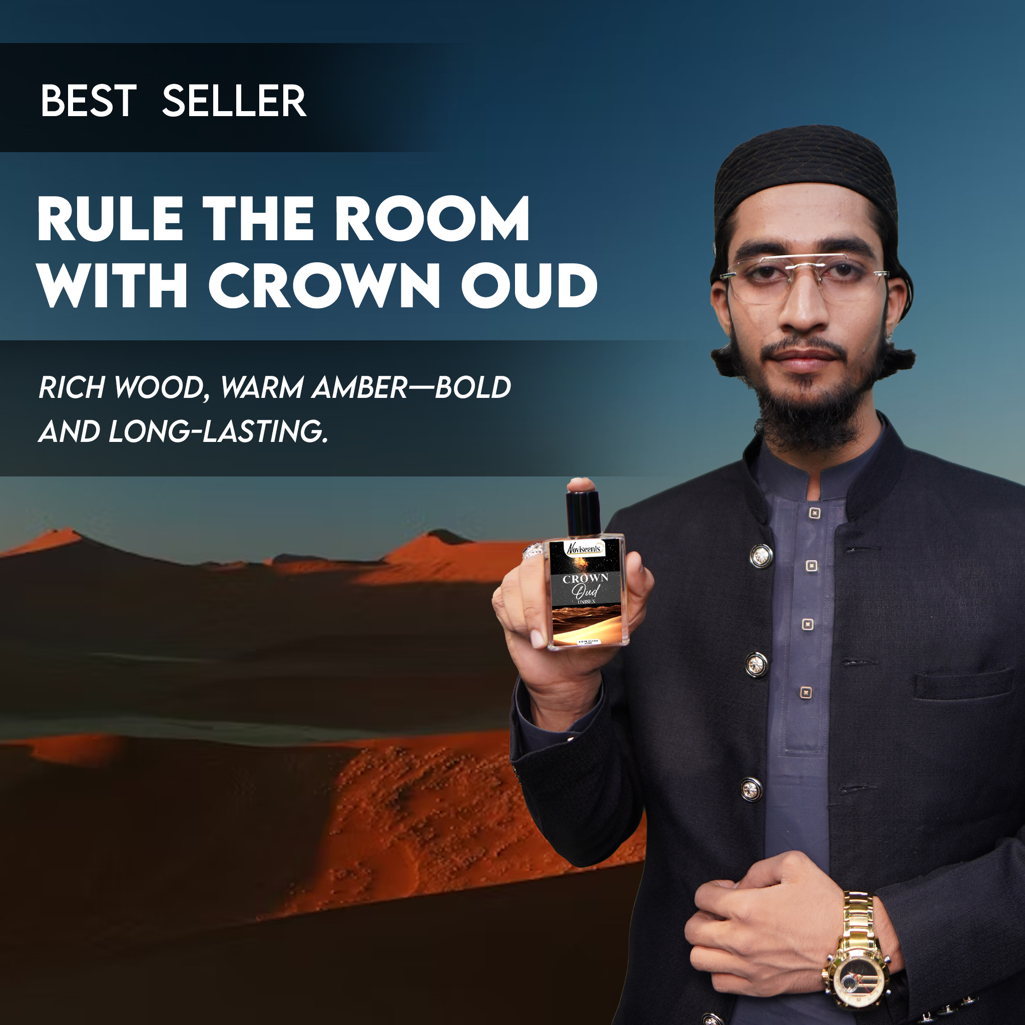 Crown Oud is a bold expression of luxury and power. A scent crafted for those who carry presence without saying a word. Rich, deep, and unapologetically intense, this fragrance pays tribute to the greatness of oud in its purest form.It opens with the spicy warmth of saffron, nutmeg, and lavender, offering an inviting and sophisticated start. The heart is dominated by the majestic note of agarwood (oud), commanding attention with its smoky, woody depth. The base settles into earthy patchouli and smooth musk, leaving a strong and lasting impression of elegance and strength.